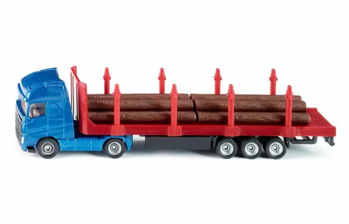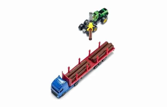 Wanneer het werk in het kinderkamerbos met de SIKU-modellen harvester, forwarder en tractor met boomstamaanhangwagen klaar is, moet de opbrengst van het bos nog naar de houtzagerij worden getransporteerd. Daarvoor zorgt de berensterke MAN-trekker met de houttransporter. De beschermwand aan de voorzijde en de rongen aan de zijkant zorgen voor een veilig transport van de kunststofboomstammen die als lading zijn bijgevoegd. Het model rijdt op rubberbanden met een velgendesign van een vrachtwagen.