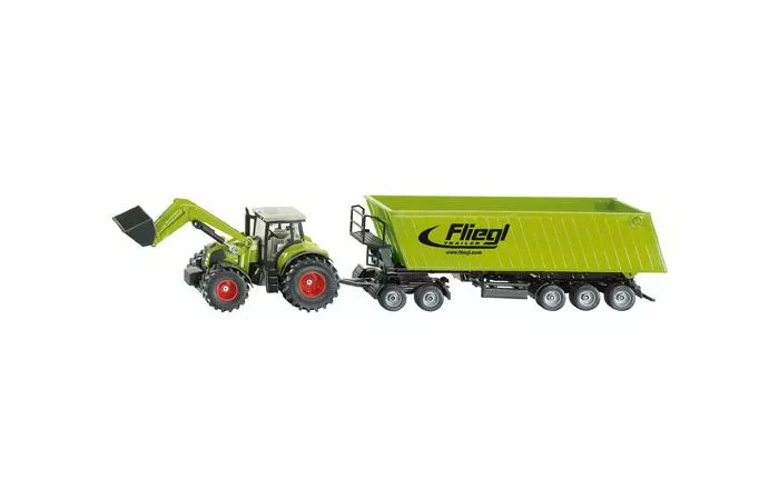 Set in zaadgroen als aanvulling op de succesvolle SIKU-landbouwserie op de schaal 1:50 waar heerlijk mee kan worden gespeeld. De Claas Axion 850 met beweegbare bak en voorladercoulisse trekt een 3-assige Fliegl-kiepwagen met kantelbak die op een dolly met tandemas is gelegd. Met deze zelfstandige combinatie van hoogwaardige metalen en kunststofonderdelen kan zowel worden geladen als getransporteerd. De kiepwagen met kantelbak met dolly kan worden gecombineerd met elke SIKU-tractor, schaal 1:50 en kan in de oogstketen tevens worden gebruikt voor het lossen van een maaidorser. De kantelbak is kantelbaar. De achterklep kan worden geopend. Uitklapbare steunvoet om de kiepwagen met kantelbak te parkeren. De dolly kan eveneens worden gebruikt met de modellen uit de SIKU-Super serie, schaal 1:50.