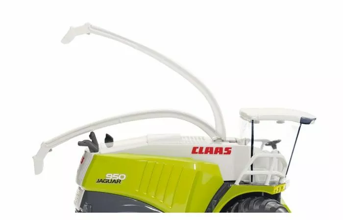 Deze hakselaar van Claas is ook in verkleinde maatstaf 1:50 een indrukwekkende verschijning met vele details en functies. De wielnaafasbesturing aan de achterkant wirdt over een draaiknop op het dak van het machinehuis bediend. De motorkleppen rechts en links evenals aan de achterkant zijn te openen en geven het zicht op een gedetailleerdgevormde motor vrij. De uitwerper is om 360 graad zwenkbaar.