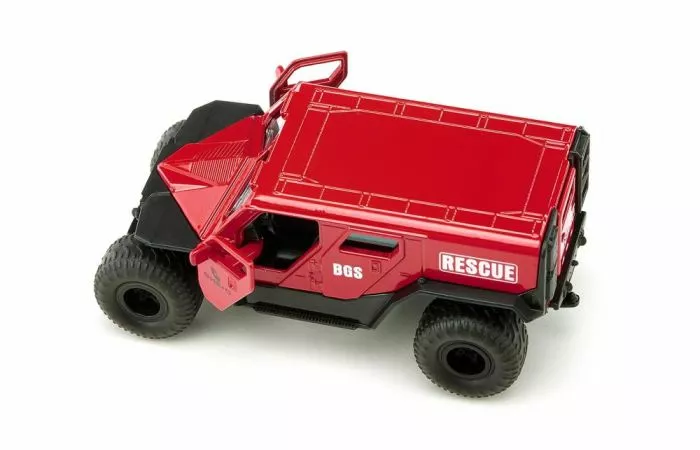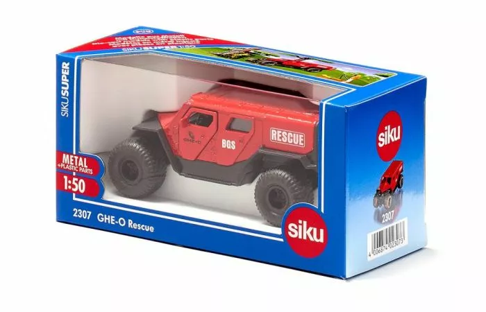 Dit hulpvoertuig heeft geen sirene of zwaailicht nodig. Aangedreven door een krachtige V8-motor baant de futuristisch vormgegeven monstertruck GHE-O Rescue zijn weg. Met de geveerde voor- en achteras en de grote ballonbanden is dit model ook uitstekend geschikt voor onbegaanbaar terrein. De banden kunnen worden afgenomen. Bij het model op schaal 1:50 kunnen de voordeuren en de achterdeur worden geopend zodat de brancard met het slachtoffer in het voertuig kan worden geschoven. Reddingmissie geslaagd!