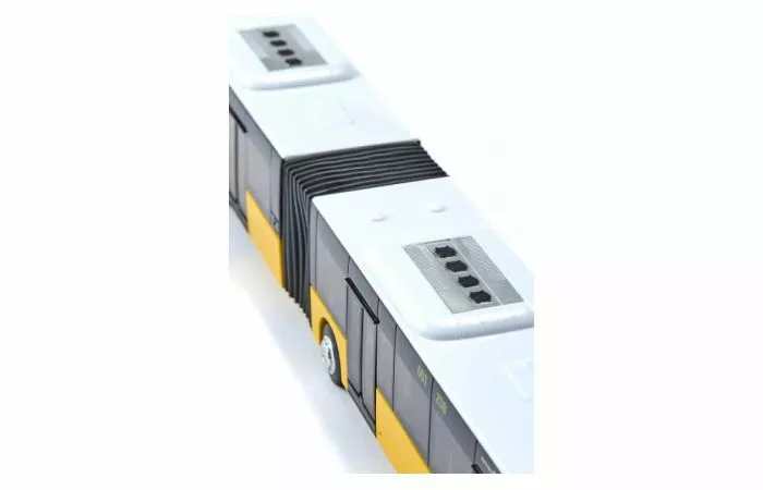 Zeer hoogwaardig busmodel van het originele voorbeeld MAN Lions City in de variant als harmonikabus in maatstaf 1:50. Wielen met gegommeerd loopvlak. 3-assen, waarbij de tweede en de derde as dubbele banden hebben. Deuren aan de rechter voertuigzijde om te openen. Motorklep achteraan om te openen. Getinte ruiten. Separate achteruitkijkspiegel en ingezette radiatorrooster. Lampen vooraan en achetraan uit kunststof. Dakopbouw met airconditioning-installatie.