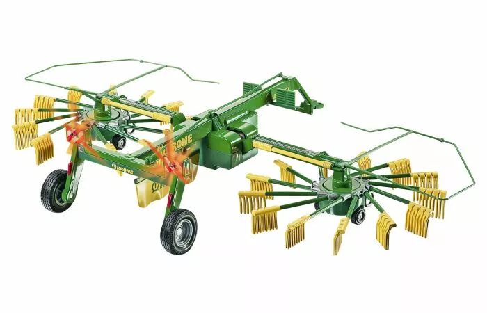 De eerste elektronisch bestuurbare 2- draaizwadkeerder van de wereld in modelmaatstaf 1:32. Met precies werkende servomotor voor het puntprecieze heffen en zakken van de zwadgyroscoop aan de wendakker. De draaibeweging van de zwadgyroscoop gebeurt mechanisch. De zwadkeerder wordt over een datakabel met de tractor verbonden. Voor de besturing van de funties van de zwadkeerder wordt het reeds voorhanden afstandsbesturingsmoduul gebruikt. De achterverlichting door rode LED’s evenals de knipperlichten rechts en links met gele LED’s ronden het beeld van de wereldwijd hoogwaardigste model-arbeidsgereedschappen in maatstaf 1:32 af.