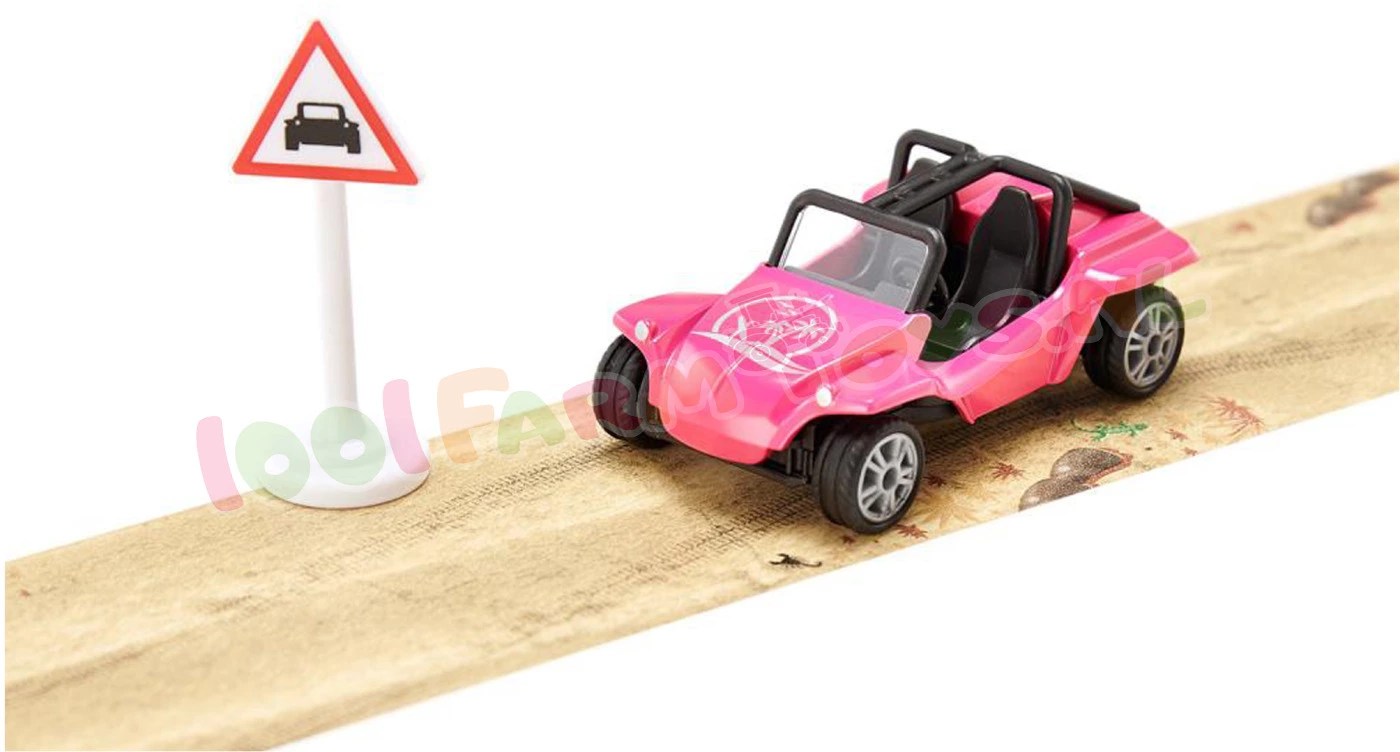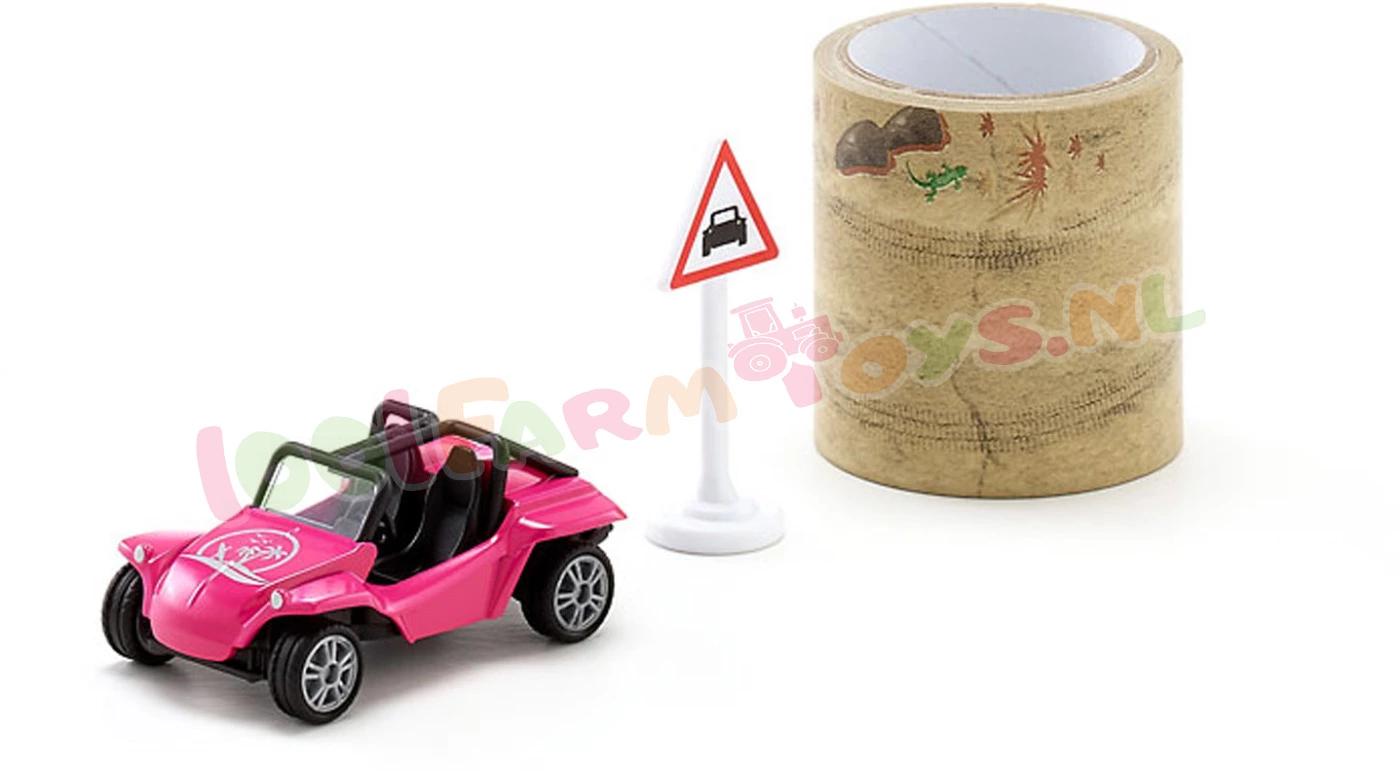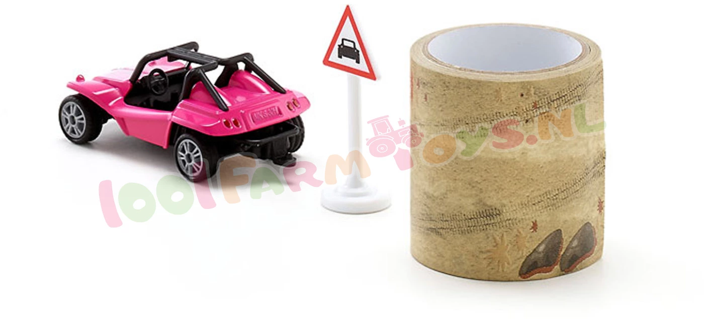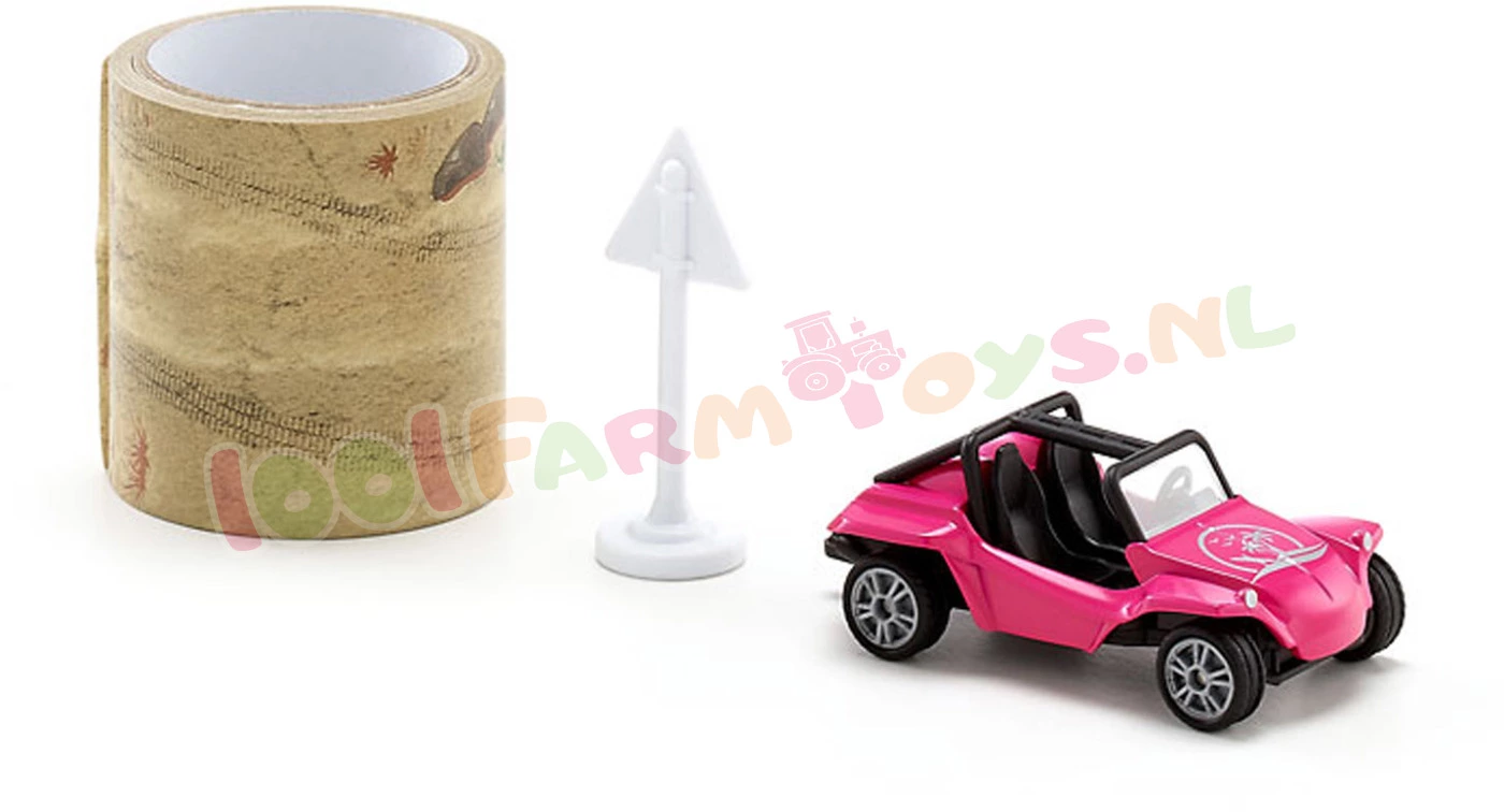 StrandgevoelZomer. zon en een Buggy. Dit was in de jaren ’60 en ‘70 dé lifestyle auto aan de Amerikaanse westkust. Op basis van een VW-kever is een groot aantal kitcars ontstaan. Een lichte kunststofcarrosserie. geen dak. geen portieren en geen ruiten maken van de zwak gemotoriseerde wagens dé auto om plezier mee te hebben. Rubberen banden op sportvelgen en een rolbeugel. de tijdreis in de roze buggy kan beginnen. Yeah! Prachtig hoe je bij siku een duin kunt uitrollen. De tape met een lengte van 5 meter hecht op gladde oppervlaken en kortpolig tapijt.