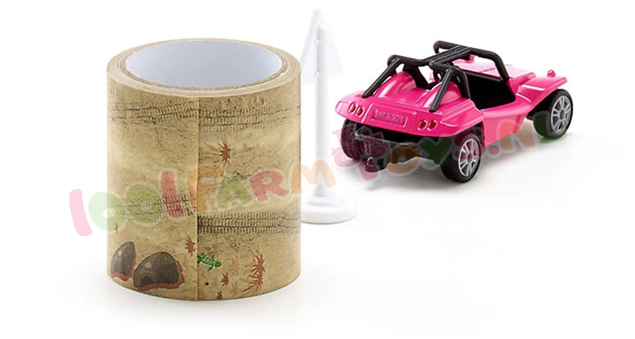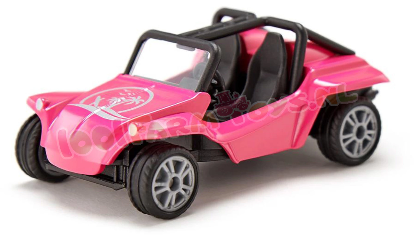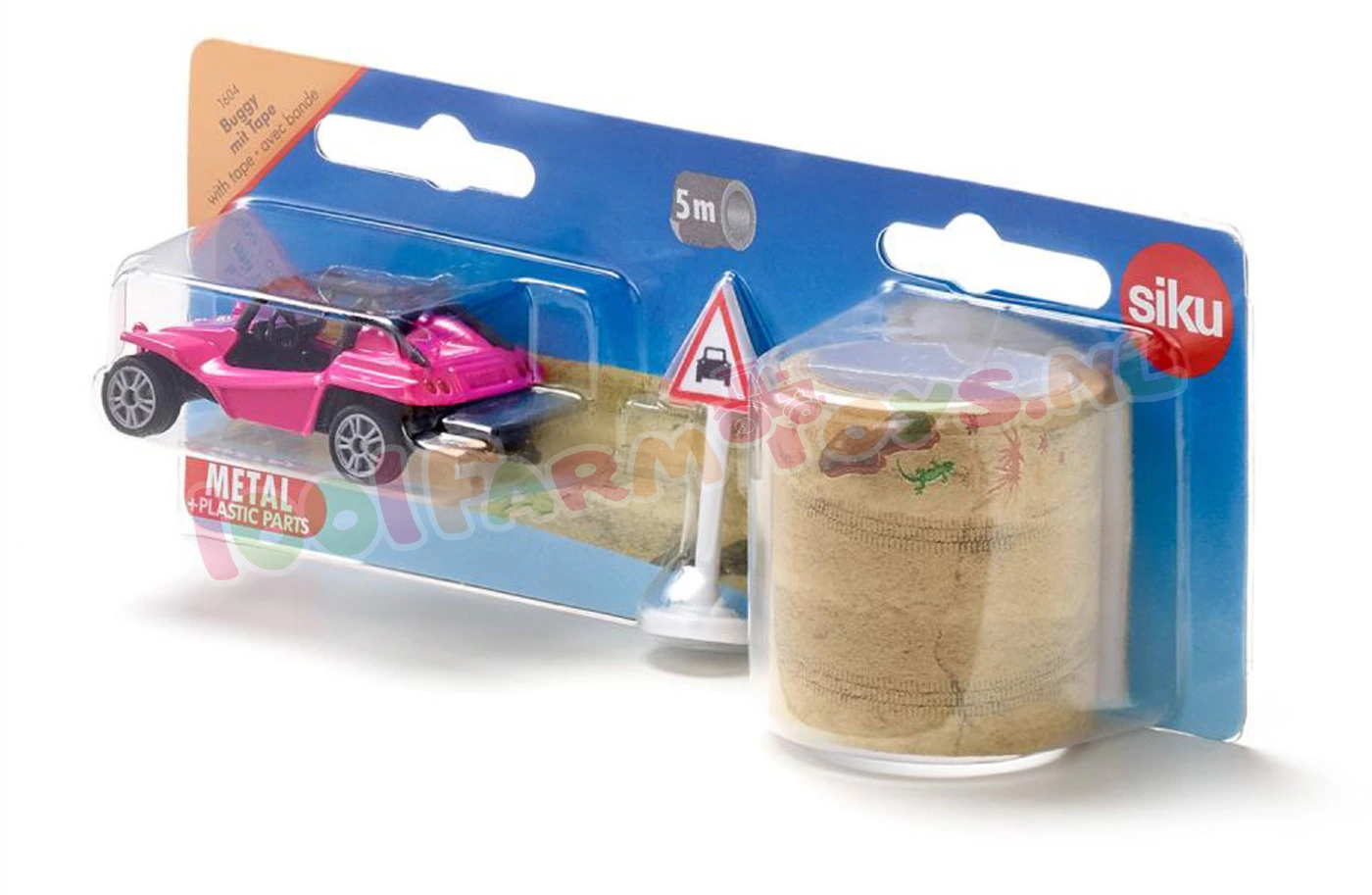 StrandgevoelZomer. zon en een Buggy. Dit was in de jaren ’60 en ‘70 dé lifestyle auto aan de Amerikaanse westkust. Op basis van een VW-kever is een groot aantal kitcars ontstaan. Een lichte kunststofcarrosserie. geen dak. geen portieren en geen ruiten maken van de zwak gemotoriseerde wagens dé auto om plezier mee te hebben. Rubberen banden op sportvelgen en een rolbeugel. de tijdreis in de roze buggy kan beginnen. Yeah! Prachtig hoe je bij siku een duin kunt uitrollen. De tape met een lengte van 5 meter hecht op gladde oppervlaken en kortpolig tapijt.