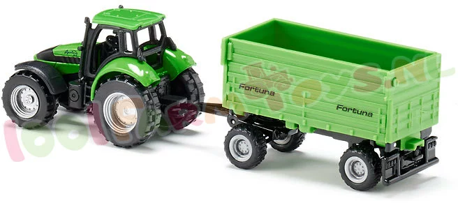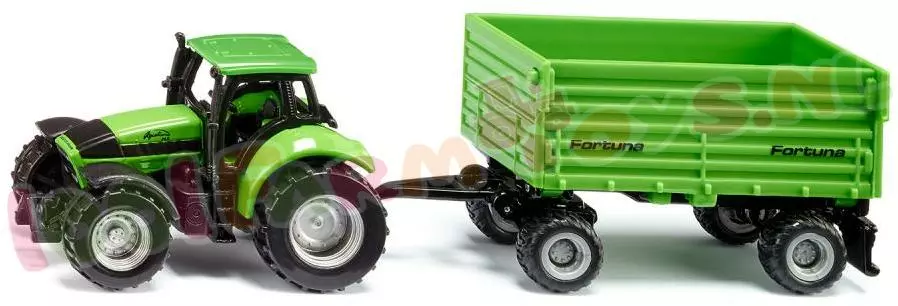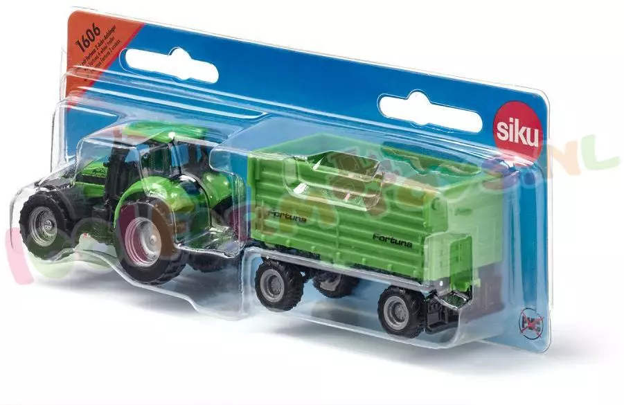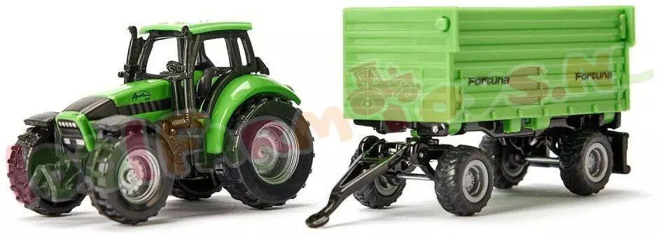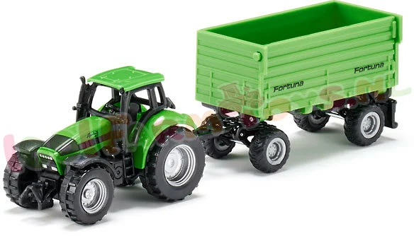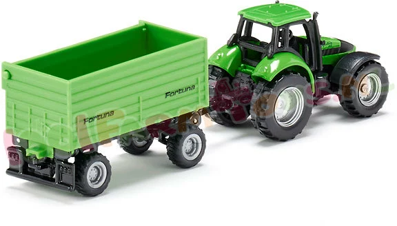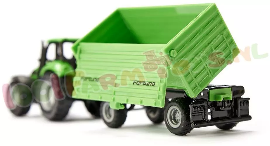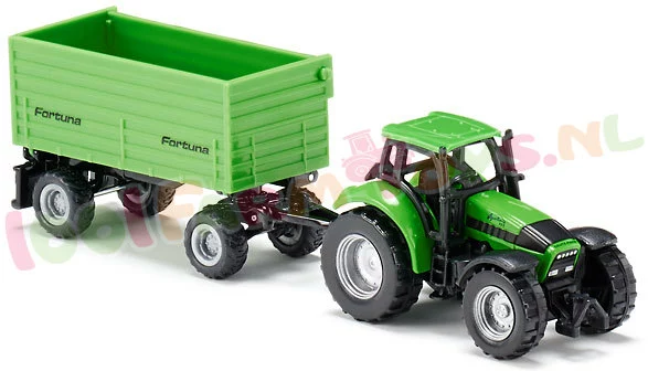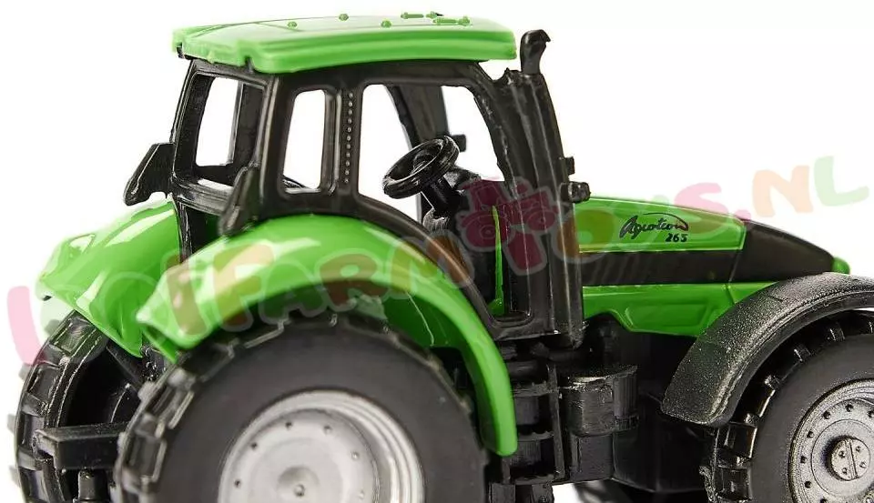 Sterk. Sterker. Deutz Agrotron! Dankzij een vermogen van 262 PK laat het model 265 de snelheidsmeter oplopen tot 50 km/uur. Zo’n krachtpatser is een must voor elke boerderij. in het echt maar ook in de speelkamer! De groen-zwarte reus is als siku-model uitgevoerd in metaal en kunststof en is voorzien van licht lopende wielen. De cabine is afneembaar waardoor het interieur van de chauffeurscabine zichtbaar wordt. Het chassis met de dissel van de aanhanger is van metaal met rubberen banden; de kunststof laadbak kan naar links worden gekanteld en de klep kan links op de aanbouw worden geopend. Dankzij de siku-standaardkoppeling zijn de tractor en de aanhanger razendsnel te combineren en klaar voor gebruik.