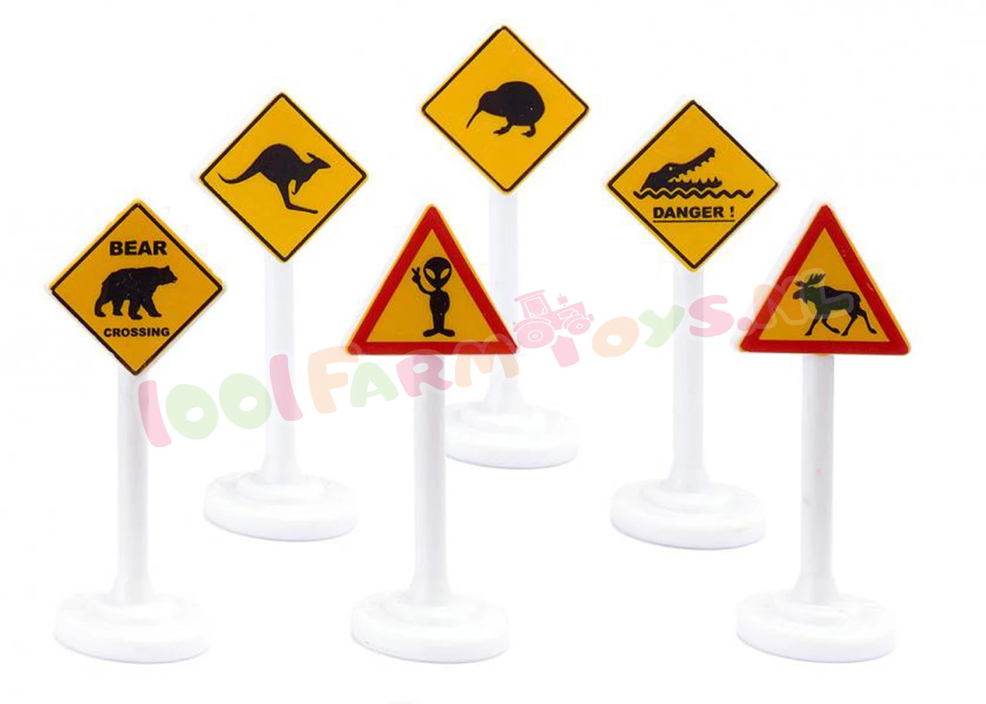 Verkeersborden vragen in landelijke gebieden om speciale aandacht voor koeien op de weg en in het bos voor overstekend wild. Er wordt echter wereldwijd met SIKU voertuigen gespeeld. Vanzelfsprekend wordt in andere landen gewaarschuwd voor andere dieren op of naast de weg: beren. elanden. kangoeroes. kiwi’s. krokodillen. En als er eens een UFO landt. zwaait de buitenaardse bezoeker vriendelijk naar je. De borden zijn uitgevoerd in hoogwaardig kunststof van beproefde SIKU kwaliteit en zijn bijzonder robuust en staan stevig. Met de internationale waarschuwingsborden gaan de SIKU voertuigen en SIKUWORLD op ontdekkingsreis naar verre landen en continenten.