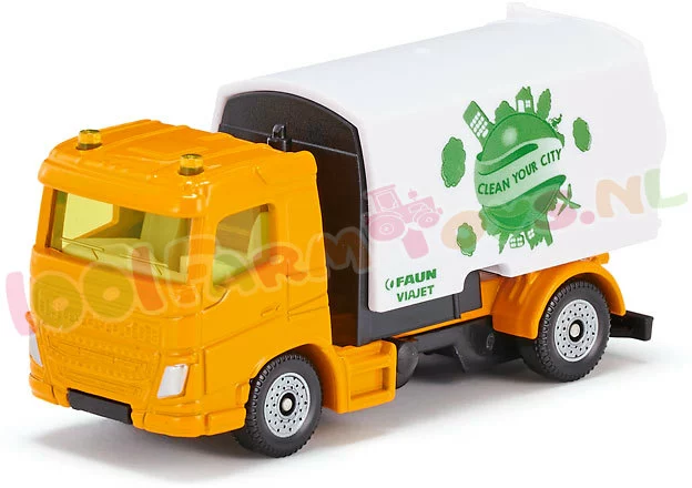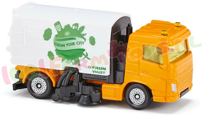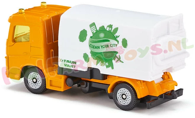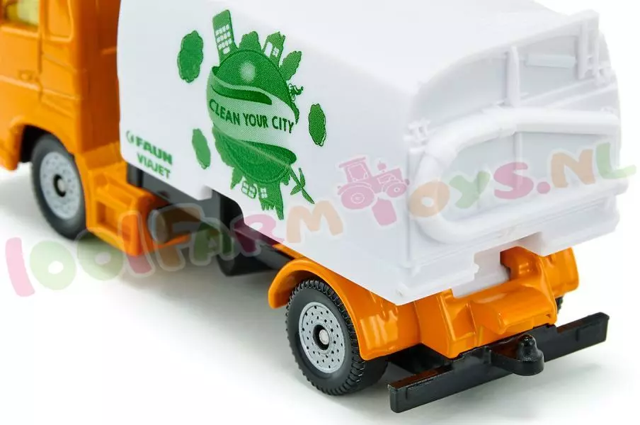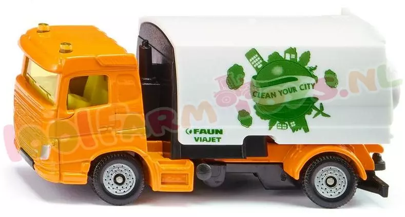 In de voetgangerszone of in een woonomgeving – de veegwagen van Faun milieutechniek zorgt overal voor een schone stad! Dankzij de licht lopende wielen en het twee-assige kunststof chassis is deze wagen bijzonder wendbaar en kan in alle straten en op pleinen worden ingezet. Met een metalen chauffeurscabine en metalen opbouw van de veegmachine en de kunststof zuiginstallatie is de wagen perfect toegerust om zelfs de smerigste schoonmaakjob tot een goed einde te brengen. De vuilcontainer kan omhoog worden geklapt om de wagen te legen. Door de stralend oranje chauffeurscabine is de veegwagen al van grote afstand te zien. Op de vuilcontainer is een opdruk “Clean your City” aangebracht.